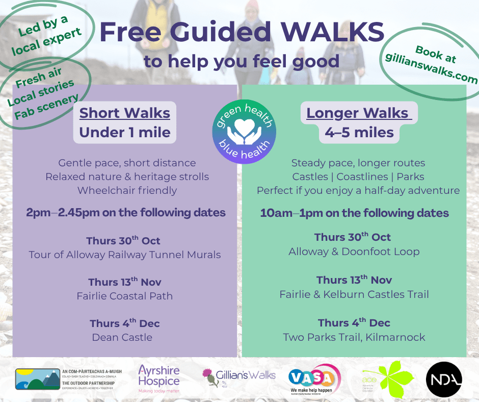 These walks have been made possible by the Scottish Government’s ‘Communities Mental Health and Wellbeing Fund’ through VASA (South Ayrshire) and the ‘Nuclear Decommissioning fund’ through The Outdoor Partnership.