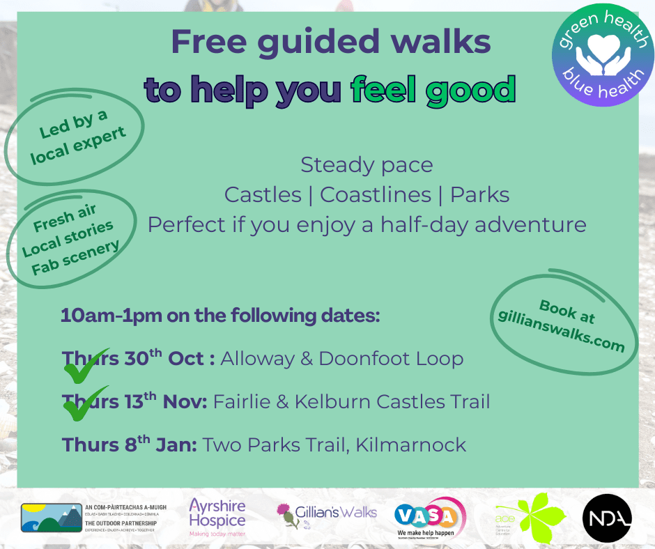 Gillian’s Walks has been working in collaboration with The Outdoor Partnership Ayrshire to offer a series of FREE guided walks, and YOU are invited! Enjoy the great outdoors, reconnect with nature and invest in your wellbeing.